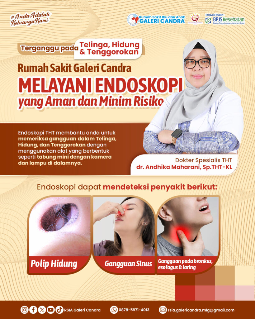 Layanan Endoskopi di Rumah Sakit Galeri Candra hadir sebagai solusi pemeriksaan sistem pencernaan yang lebih akurat, aman, dan minim rasa nyeri. Dengan teknologi kamera fleksibel beresolusi tinggi, prosedur ini memungkinkan dokter melihat kondisi saluran cerna secara langsung, termasuk kerongkongan, lambung, dan usus, tanpa operasi besar.