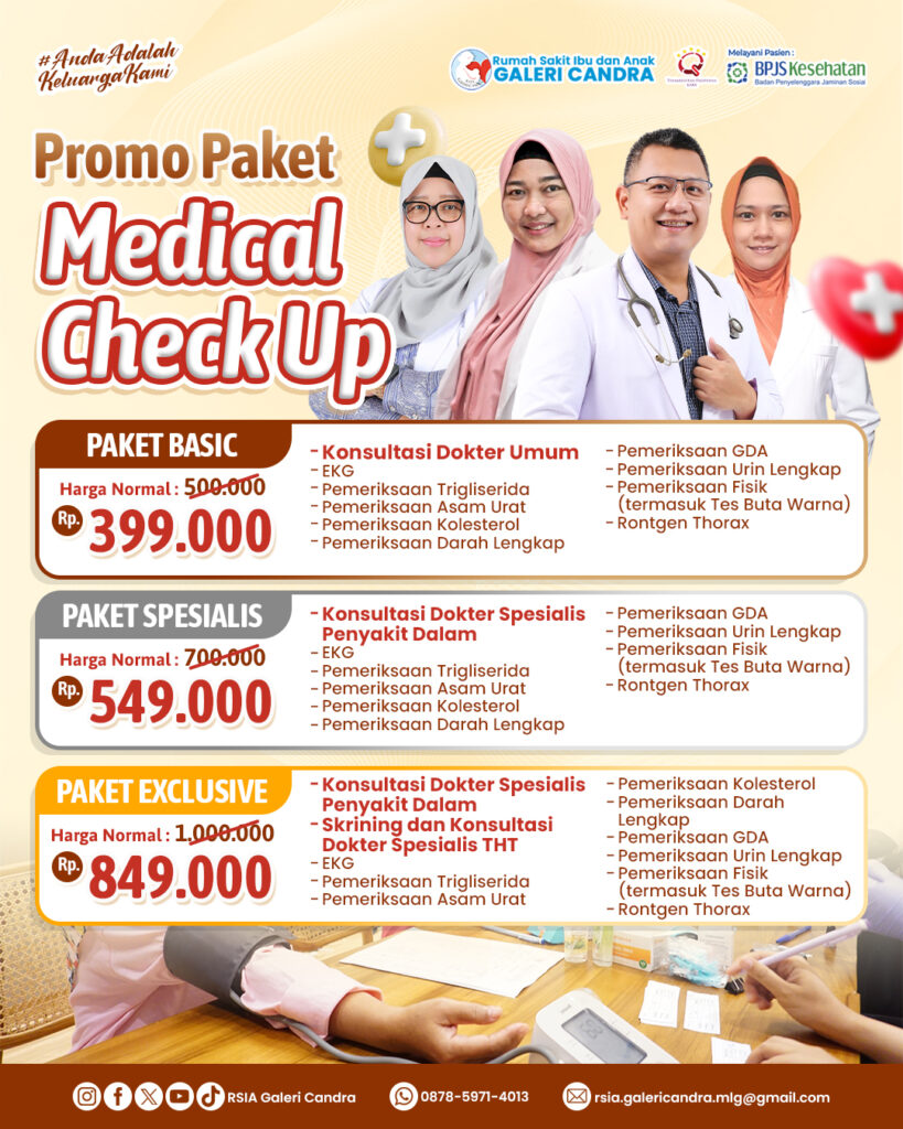 Rumah Sakit Galeri Candra menghadirkan promo paket Medical Check Up (MCU) bagi anda yang peduli dengan kesehatan dan ingin melakukan pemeriksaan menyeluruh secara berkala.
